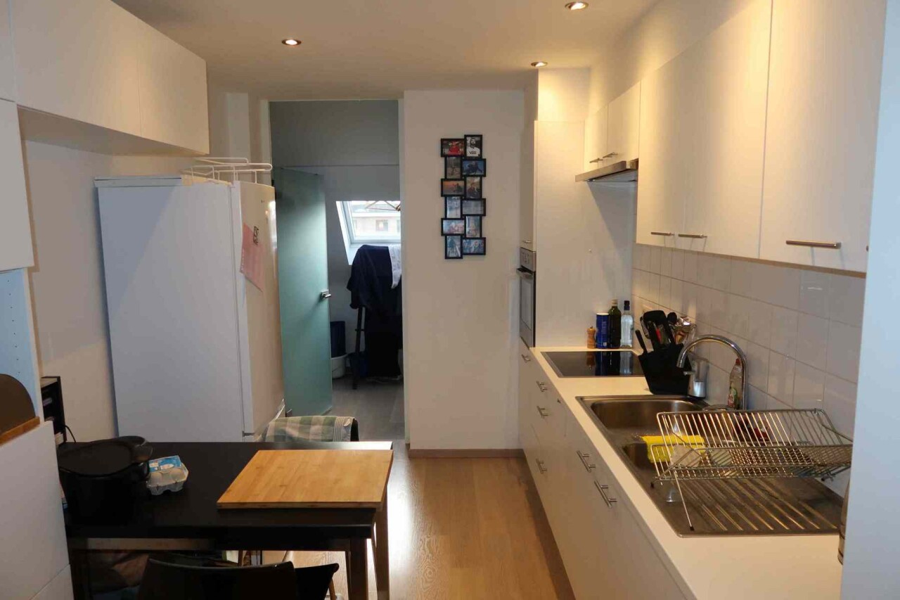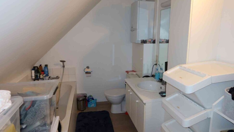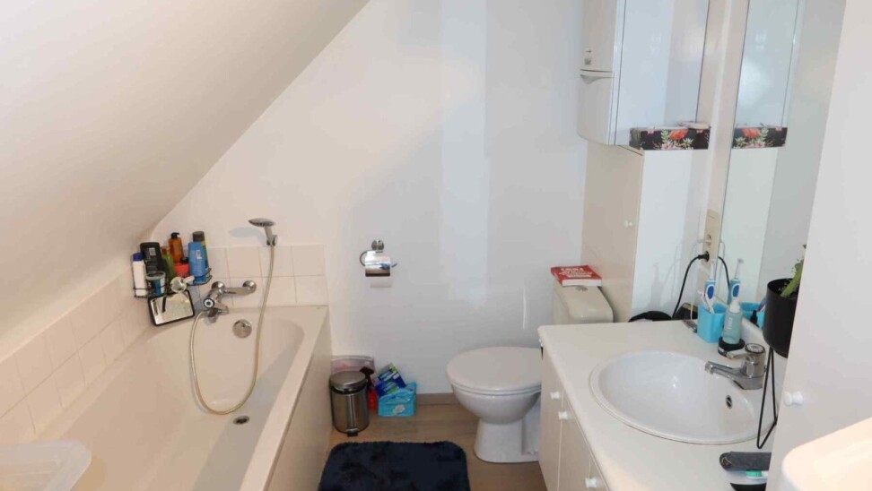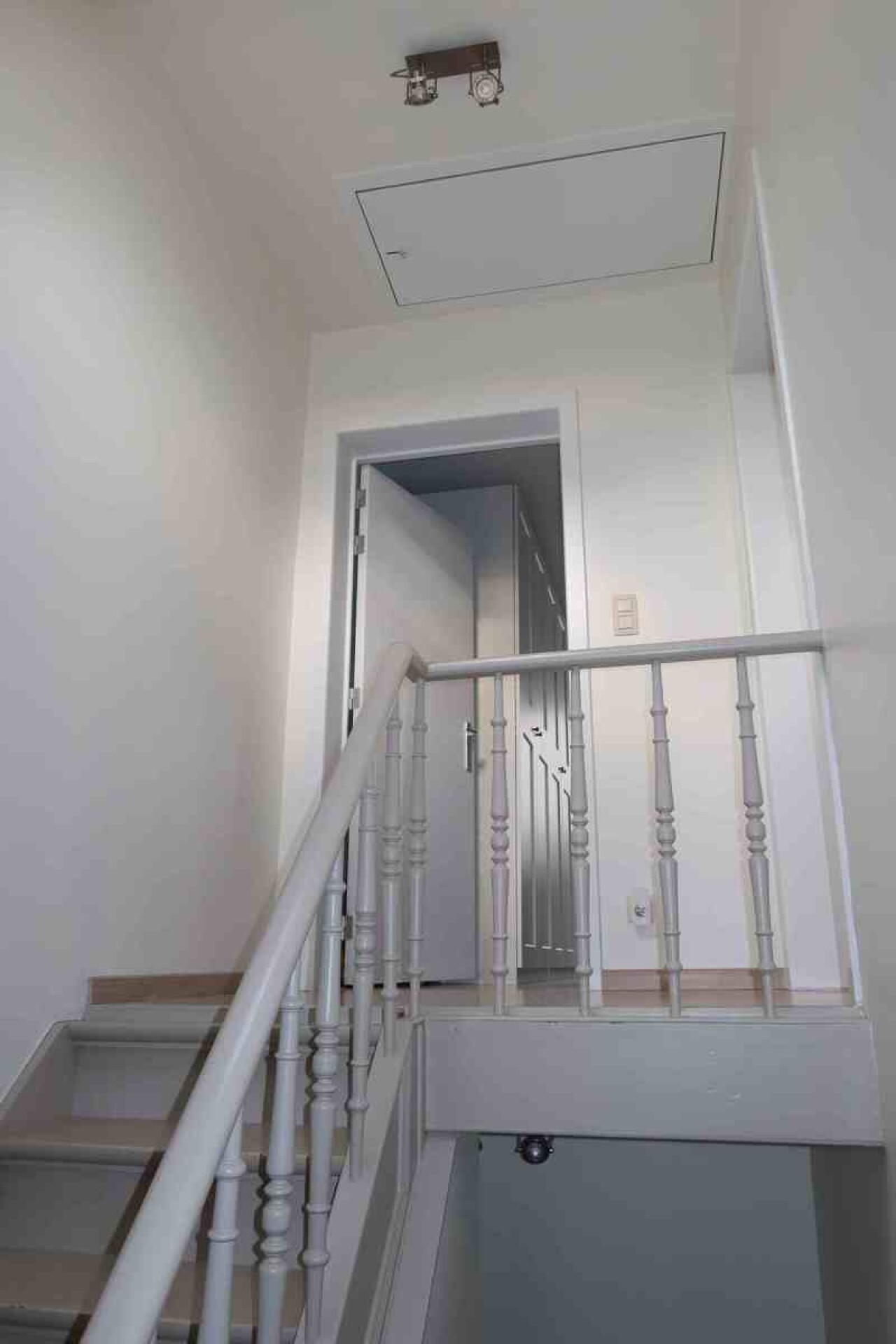 Dit duplex appartement heeft een eigen (privé) inkom (met plaats voor fiets), via de trap kom je op het halletje van de 1e verdieping. Daar bevinden zich een leefruimte, aparte keuken met alle toestellen en de badkamer met ligbad – lavabo meubel – toilet en plaats voor wasmachine. Op de 2e verdieping vind je naast het bureau (of kleine slaapkamer) nog een master bedroom (22m²).