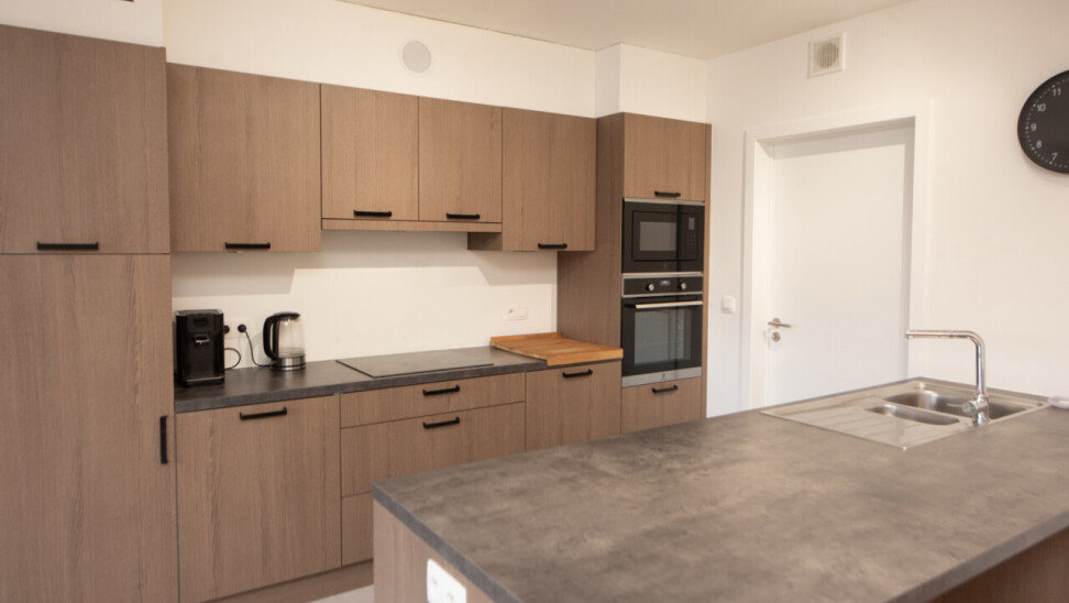 Het appartement beschikt over een inkomhal met apart gastentoilet, een aangename en lichtrijke woonkamer met directe toegang tot het zonneterras, en een moderne, volledig geïnstalleerde keuken met praktische berging.