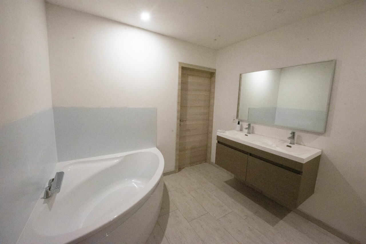 Op het gelijkvloers vindt u een ruime inkomhal, lichtrijke leefruimte, geïnstalleerde keuken met vaatwasser, aardgasvuur, dampkap, oven, microgolf. Badkamer met inloopdouche, hoekbad, dubbele lavabo, toilet. Technische ruimte/ berging. Grote garage.