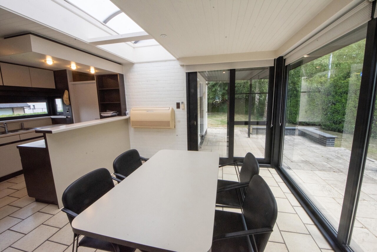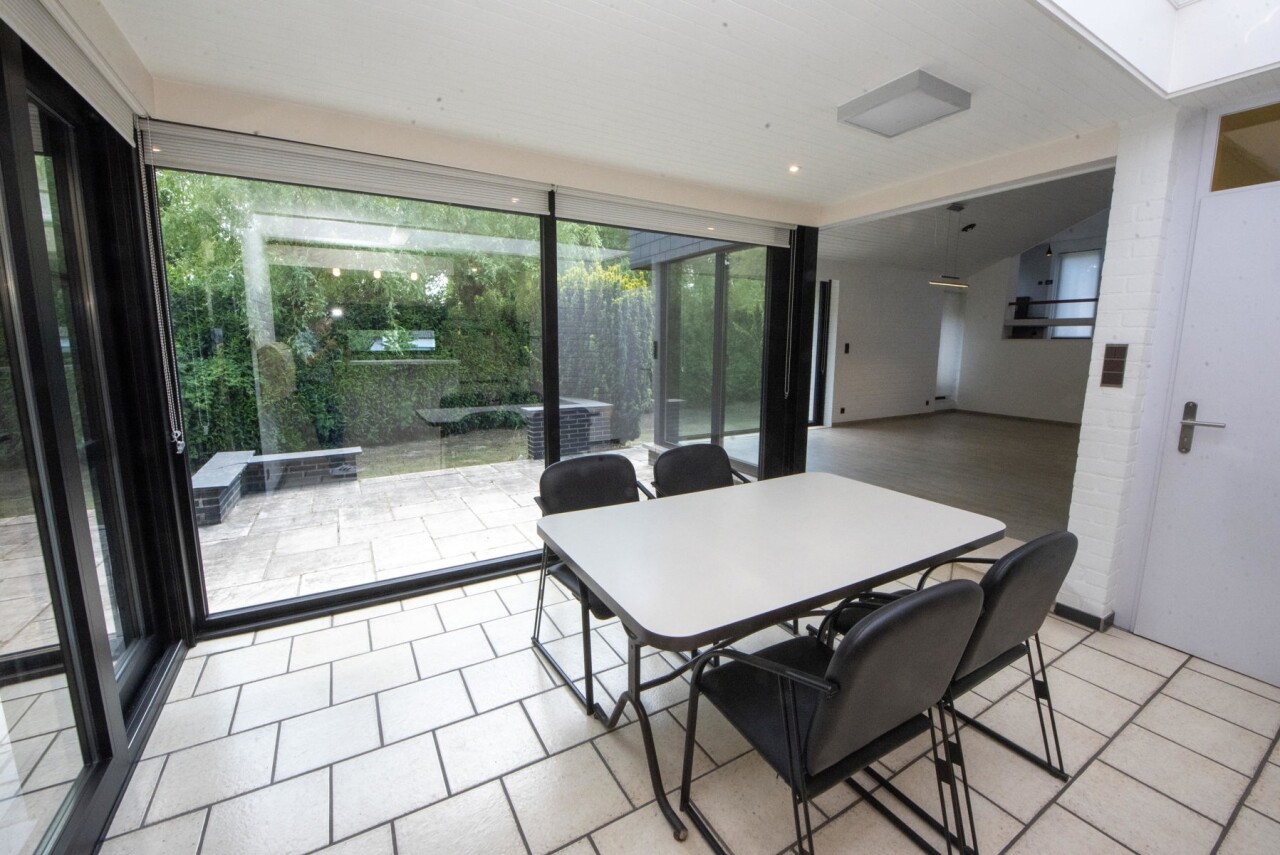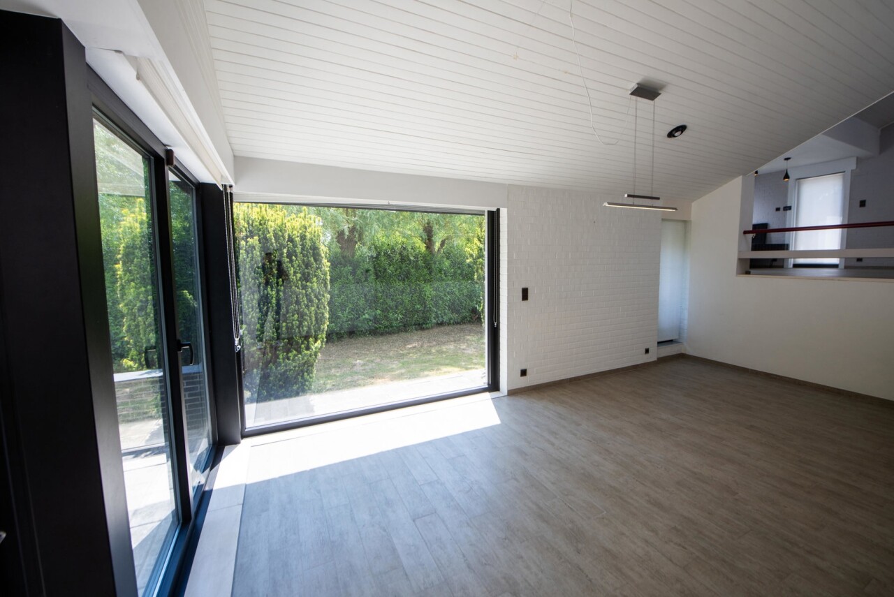 - Tussenverdieping: prachtige living met zitkuil, baadt in het licht en biedt een sfeervol uitzicht op de aangelegde tuin.